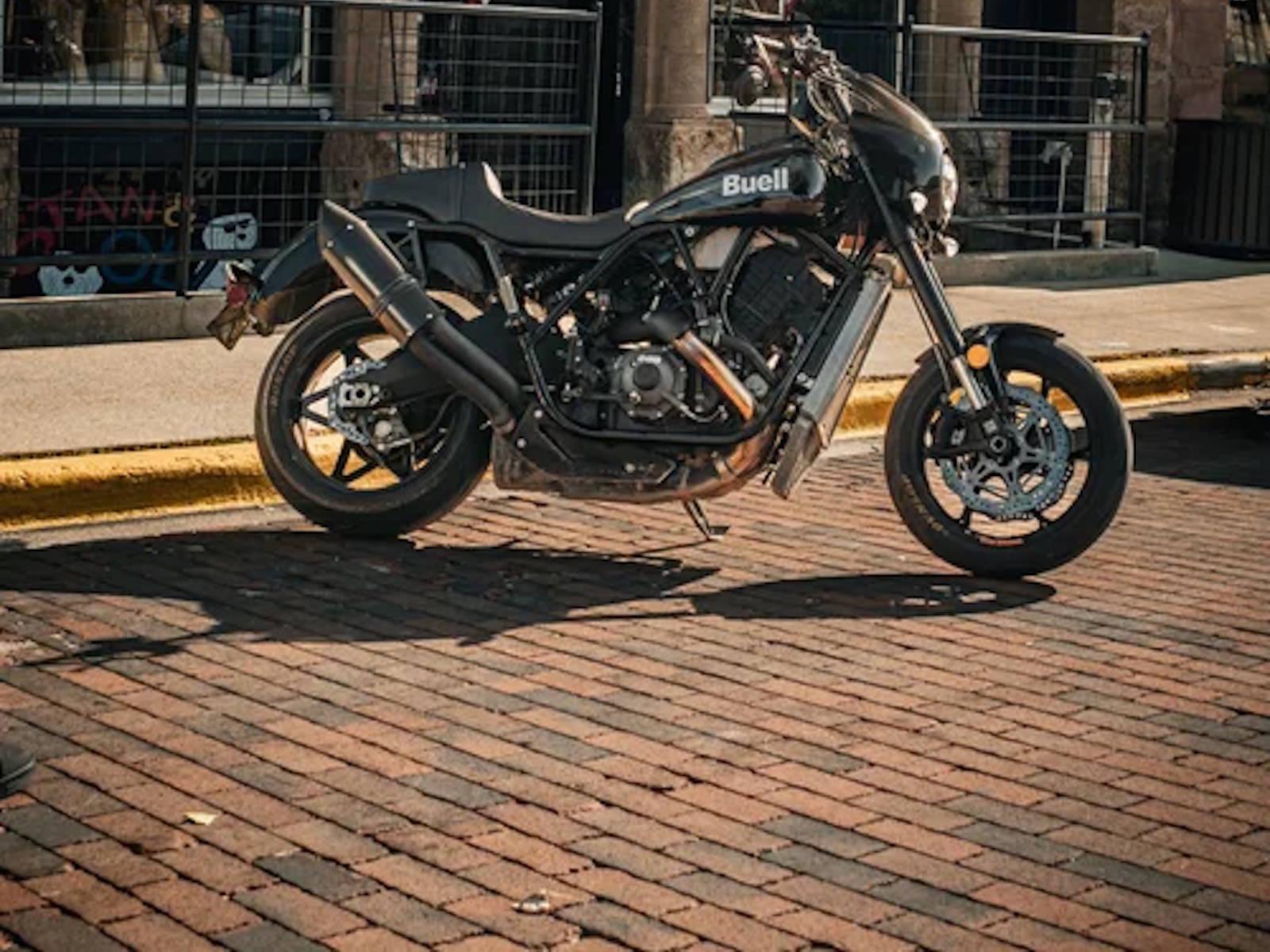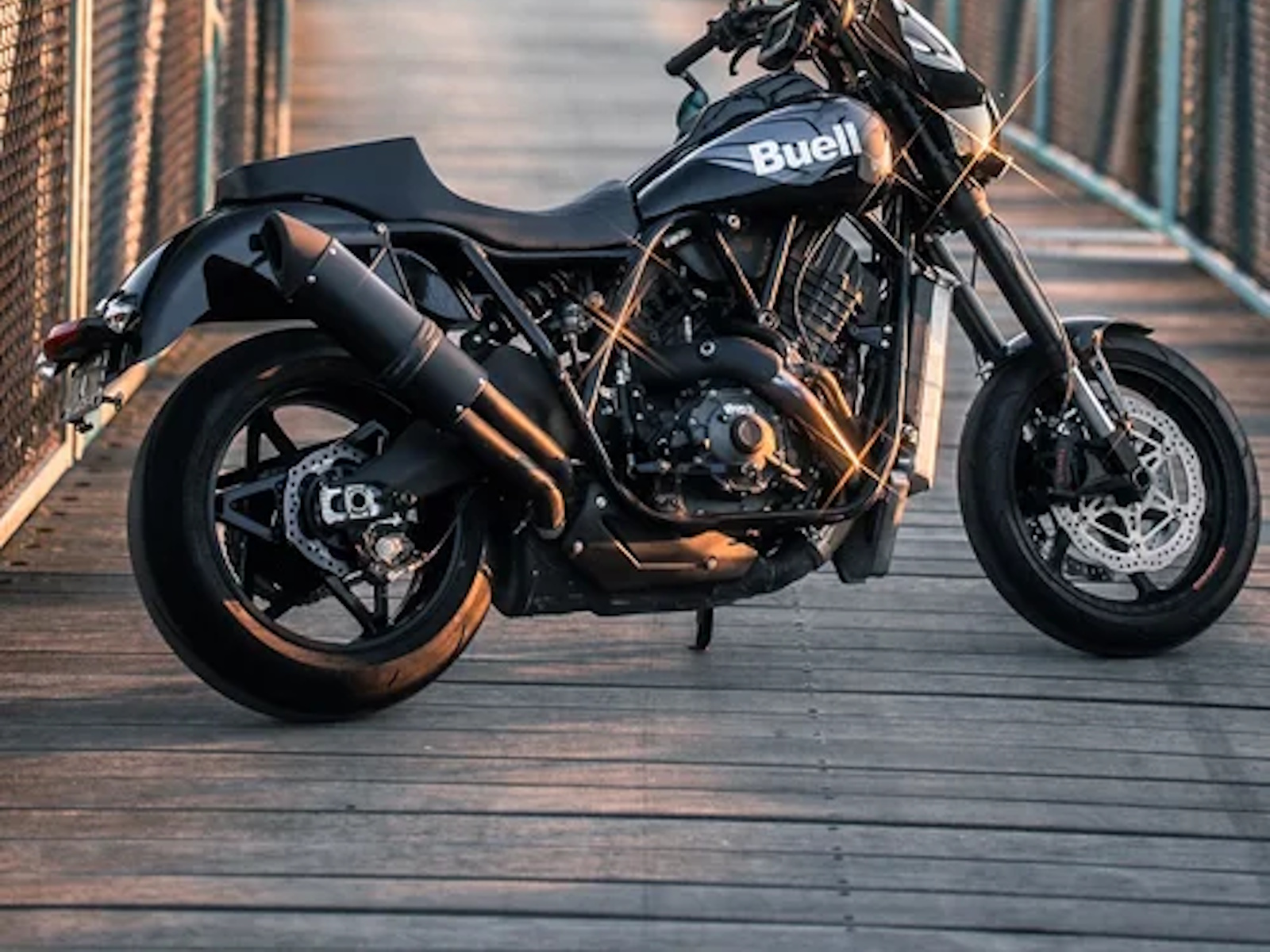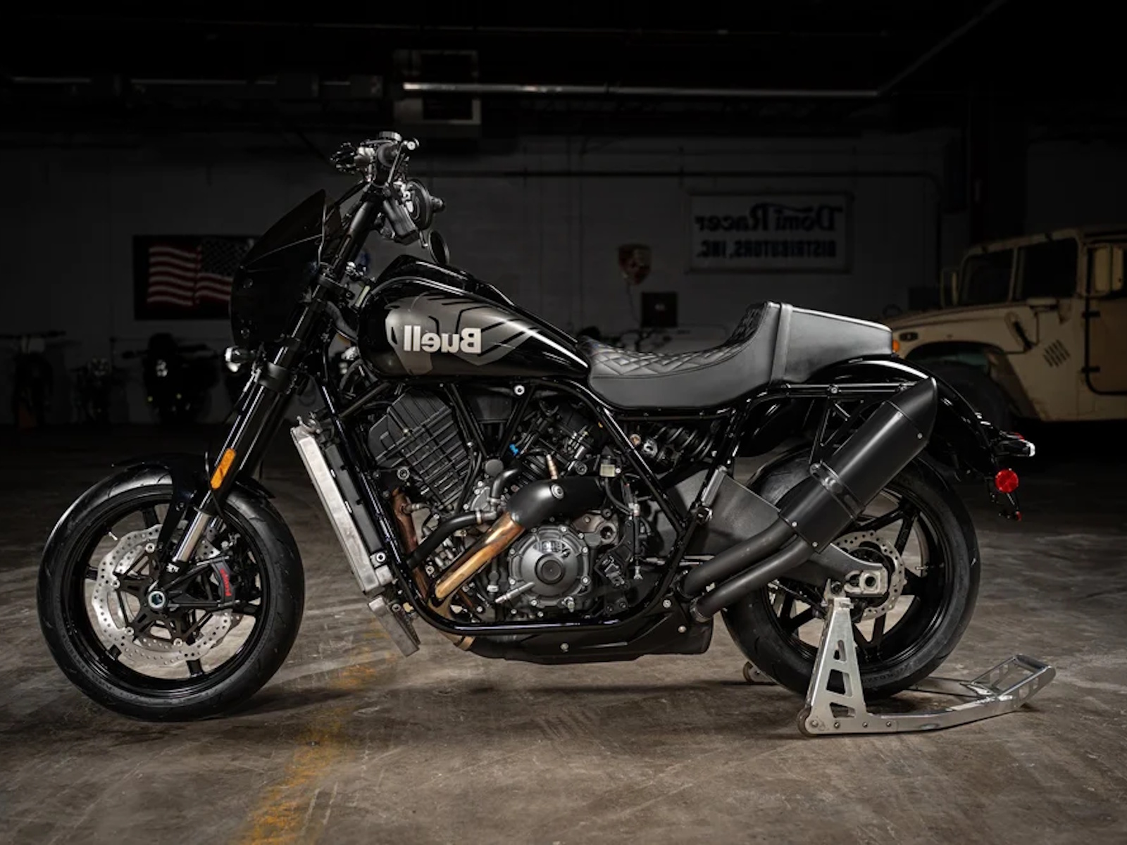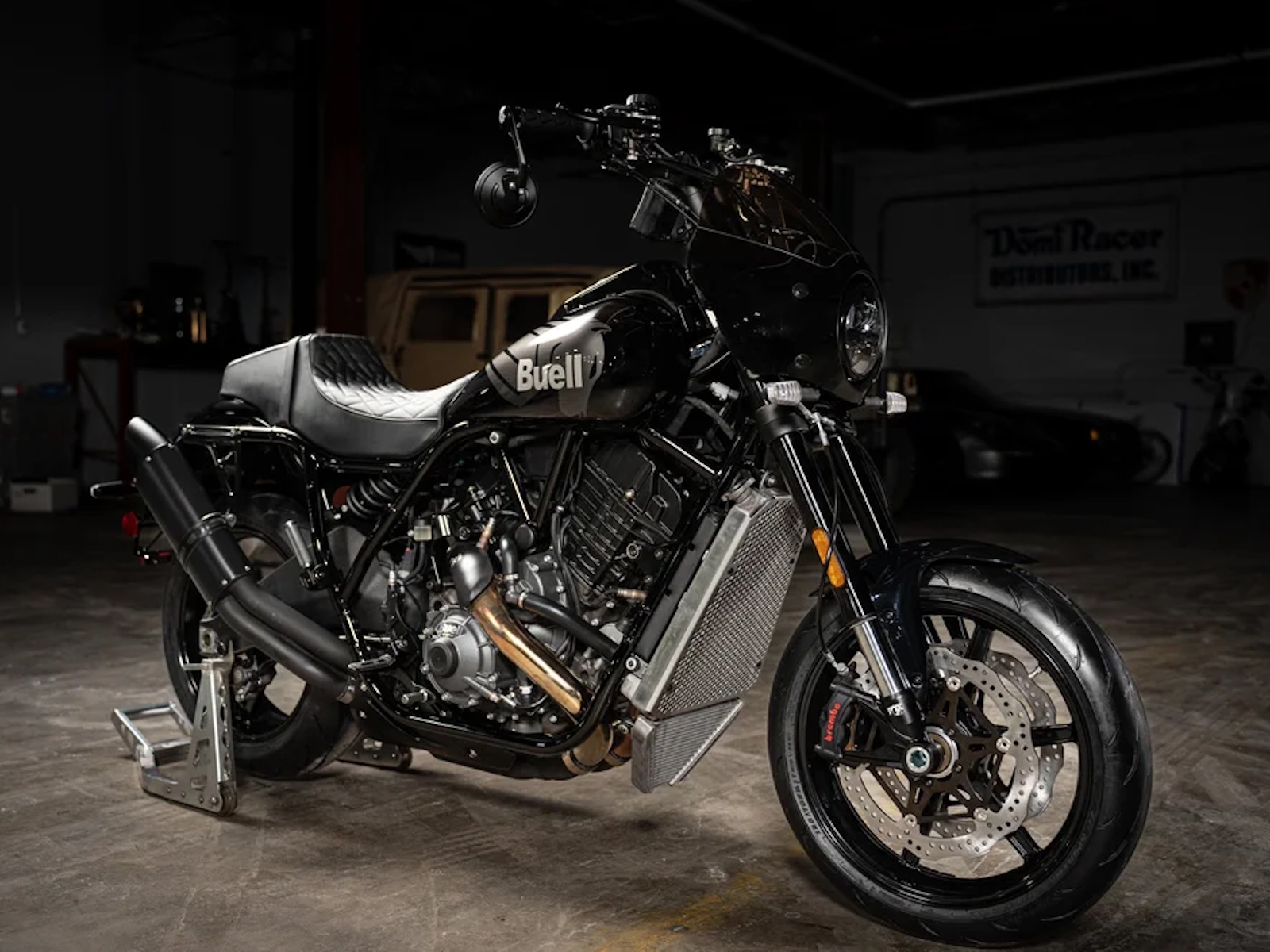 Standard Parts: FOX Suspension (front, rear, damper), Brembo dual-disc brake system, Dunlop Sportmax Q5A tires, custom Buell/Saddlemen seat, Memphis Shades cafe-style front fairing.