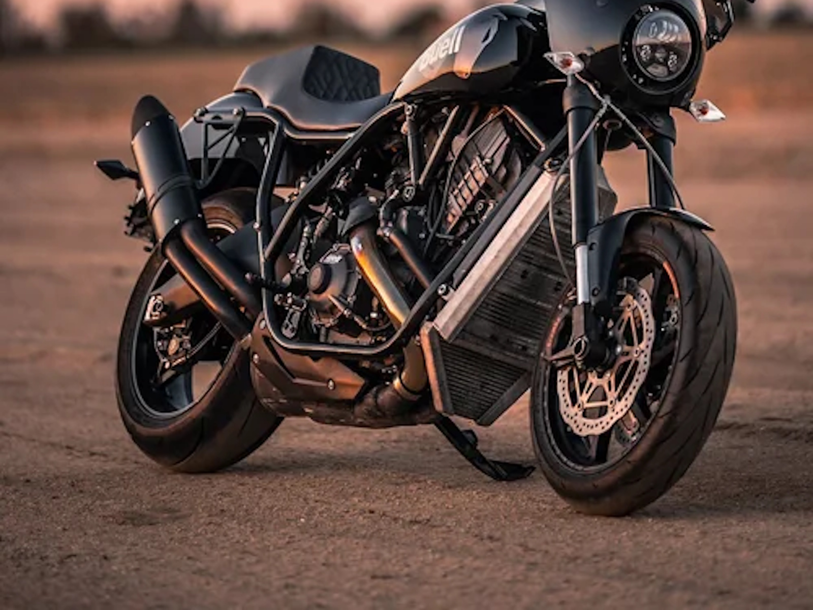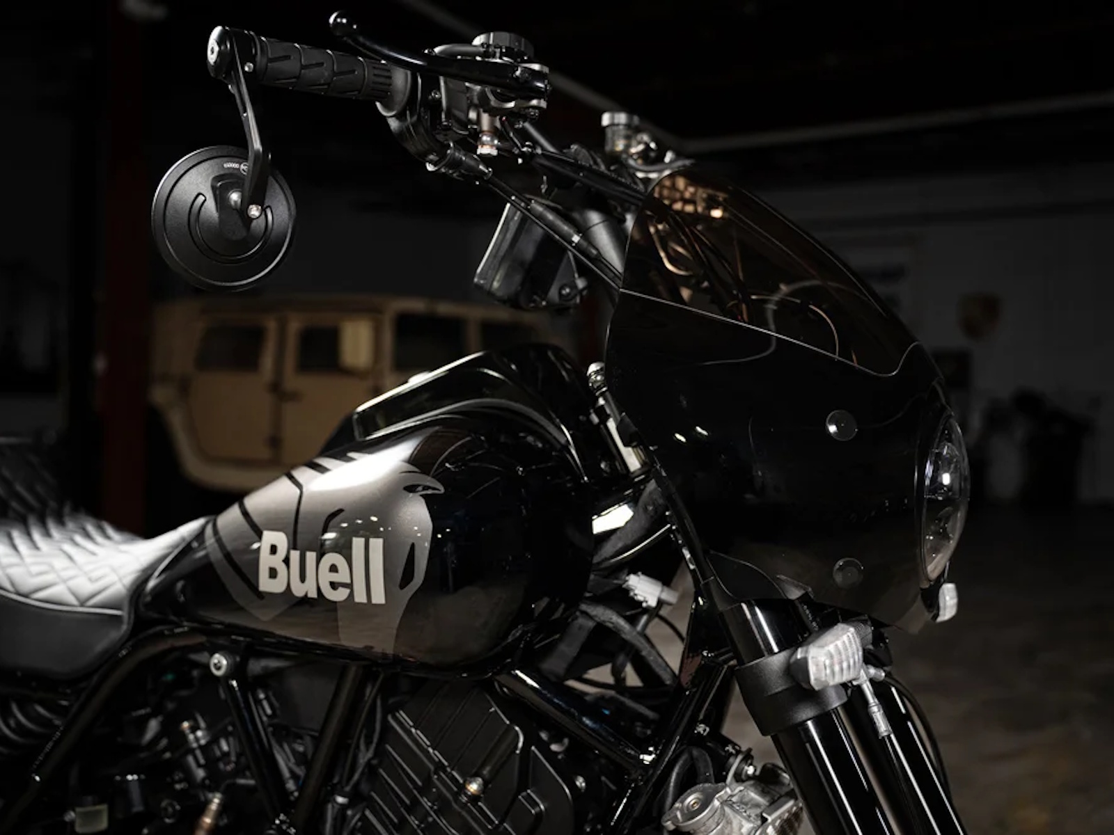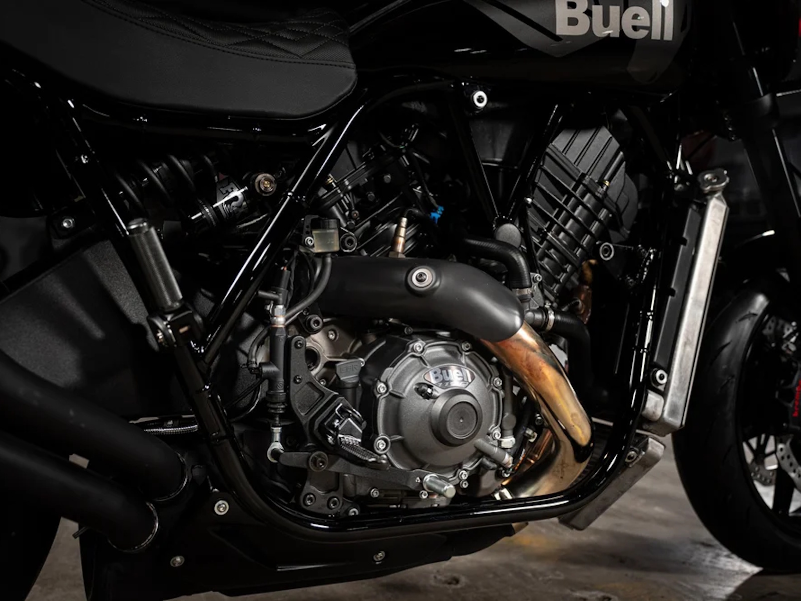 Standard Parts: FOX Suspension (front, rear, damper), Brembo dual-disc brake system, Dunlop Sportmax Q5A tires, custom Buell/Saddlemen seat, Memphis Shades cafe-style front fairing.
