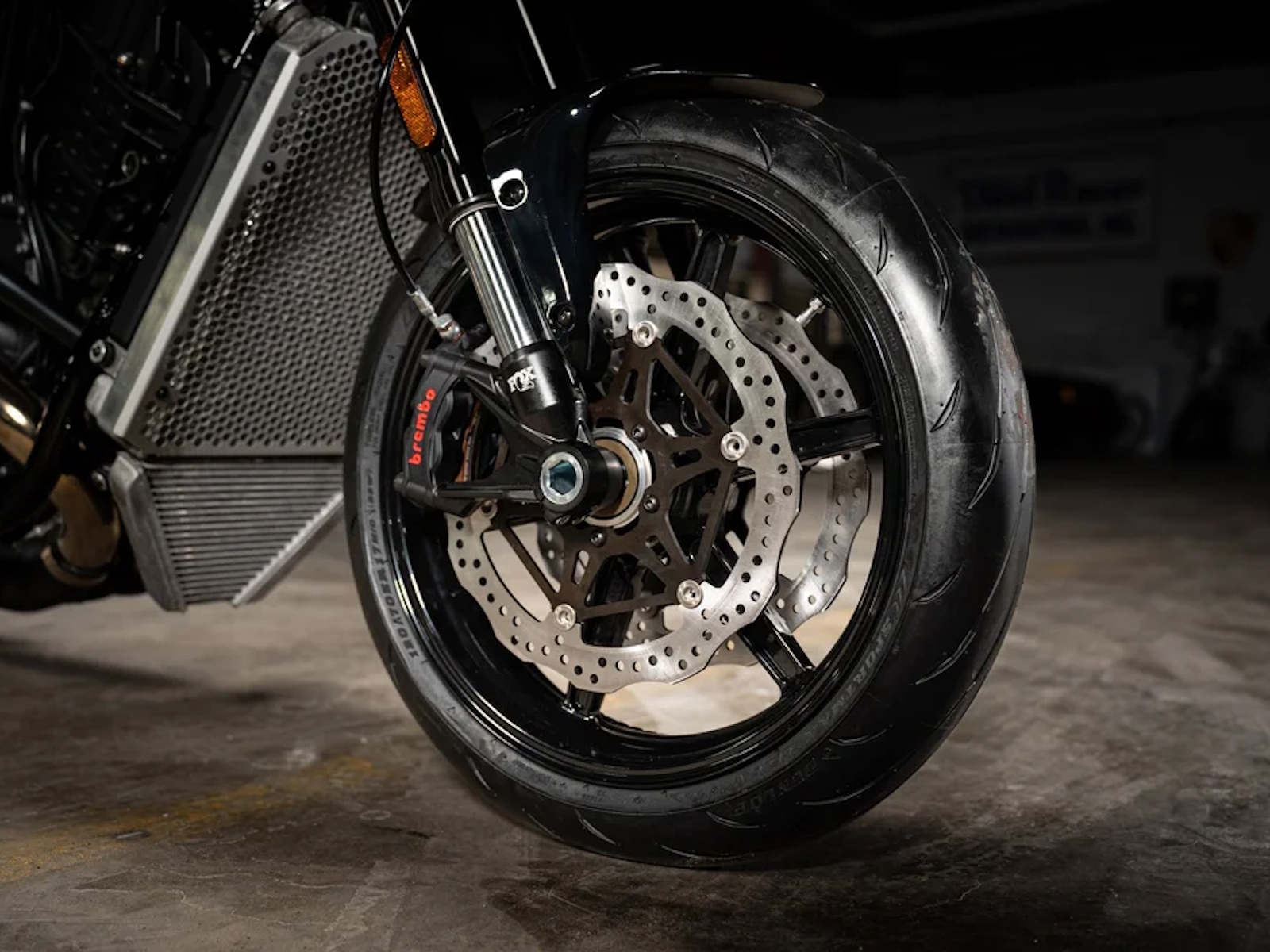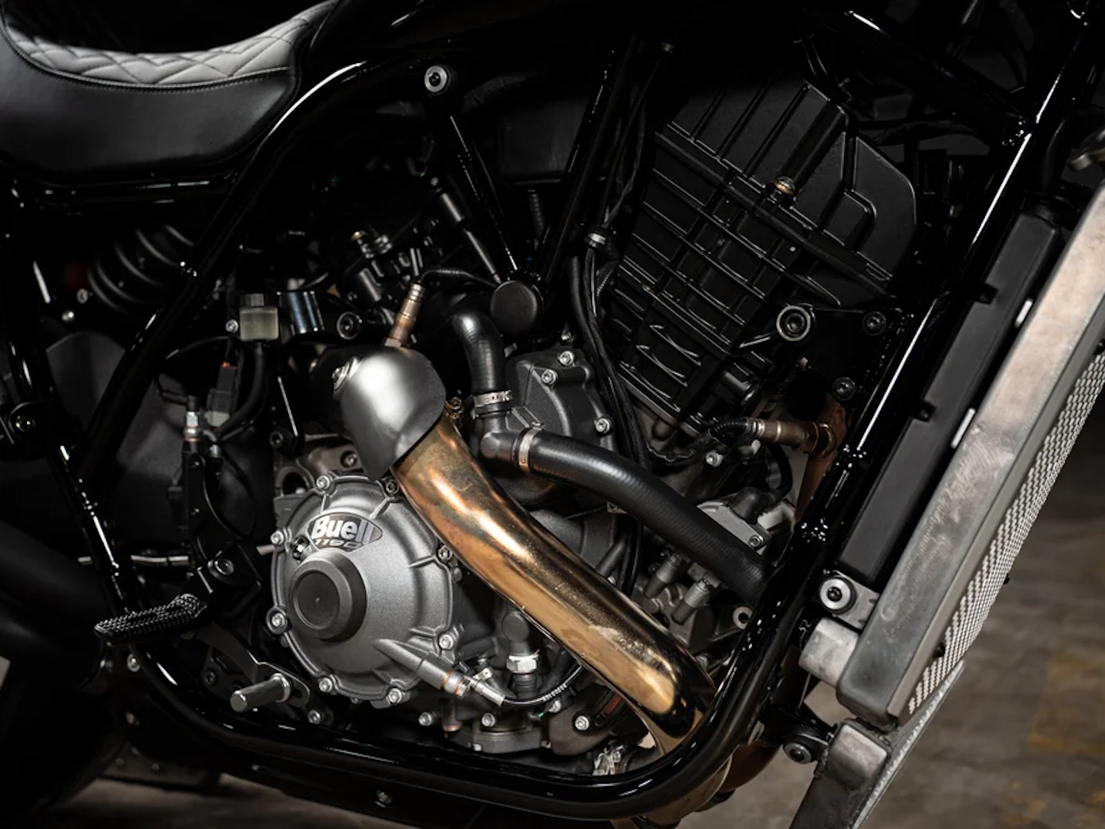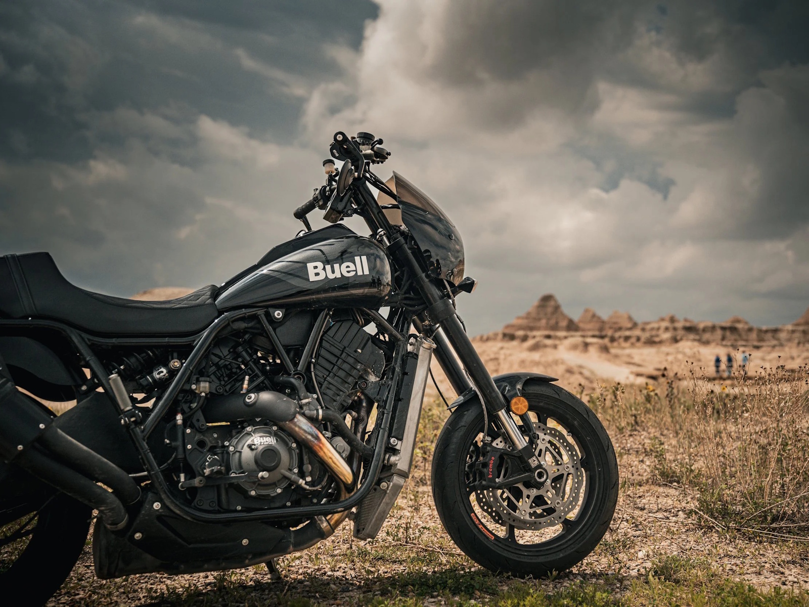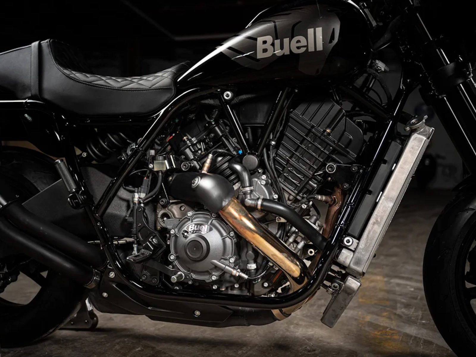 Standard Parts: FOX Suspension (front, rear, damper), Brembo dual-disc brake system, Dunlop Sportmax Q5A tires, custom Buell/Saddlemen seat, Memphis Shades cafe-style front fairing.