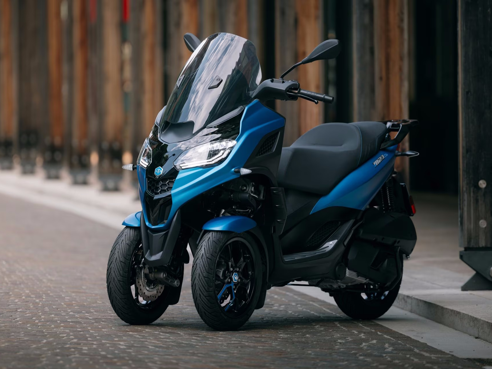 - The Piaggio MP3 Sport delivers a unique riding experience courtesy of the dual front wheel set-up and articulated quadrilateral suspension, a combination that delivers a higher level of cornering stability than any other scooter. One of the Piaggio MP3 family’s distinctive characteristics is the front suspension blocking mechanism which ensures the scooter maintains its balance on all three wheels without needing a stand, even though the bike comes with one already fitted. This means you never need to place your feet on the ground, making parking a breeze.