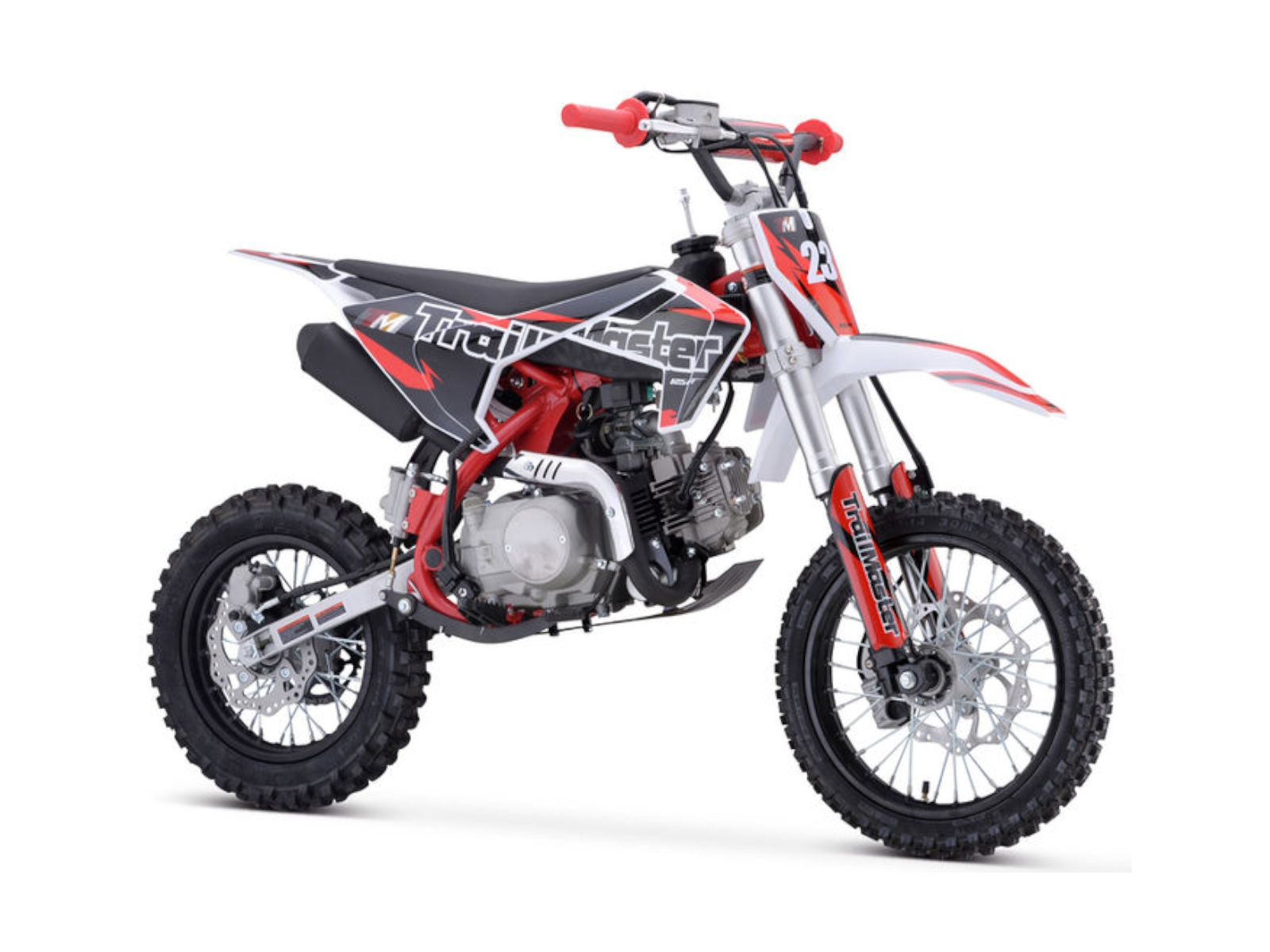 The TM 23‐125 is a great Junior size dirt bike that has both Electric and Kick Start. It has a high performance 125cc 4 stroke 8.3hp engine and a top speed of around 45 MPH and a seat height of 29”. It is available in red, blue, green, and orange colors. The TM23 features a 4 speed Automatic (No Clutch) transmission with front and rear disc brakes, and a heavy duty frame built for durability! This is sure to be a HOT seller! The bikes full on motocross ergonomics and race suspension system make handling feel natural and unforced, and help it navigate over almost any type of terrain. Electronic CDI ignition makes kick starting effortless, keeps the bike running smoothly in all gears and provides a broad, even power band. And at only 161 pounds, the 125cc engine can propel the motorcycle to speeds of 45 miles per hour.