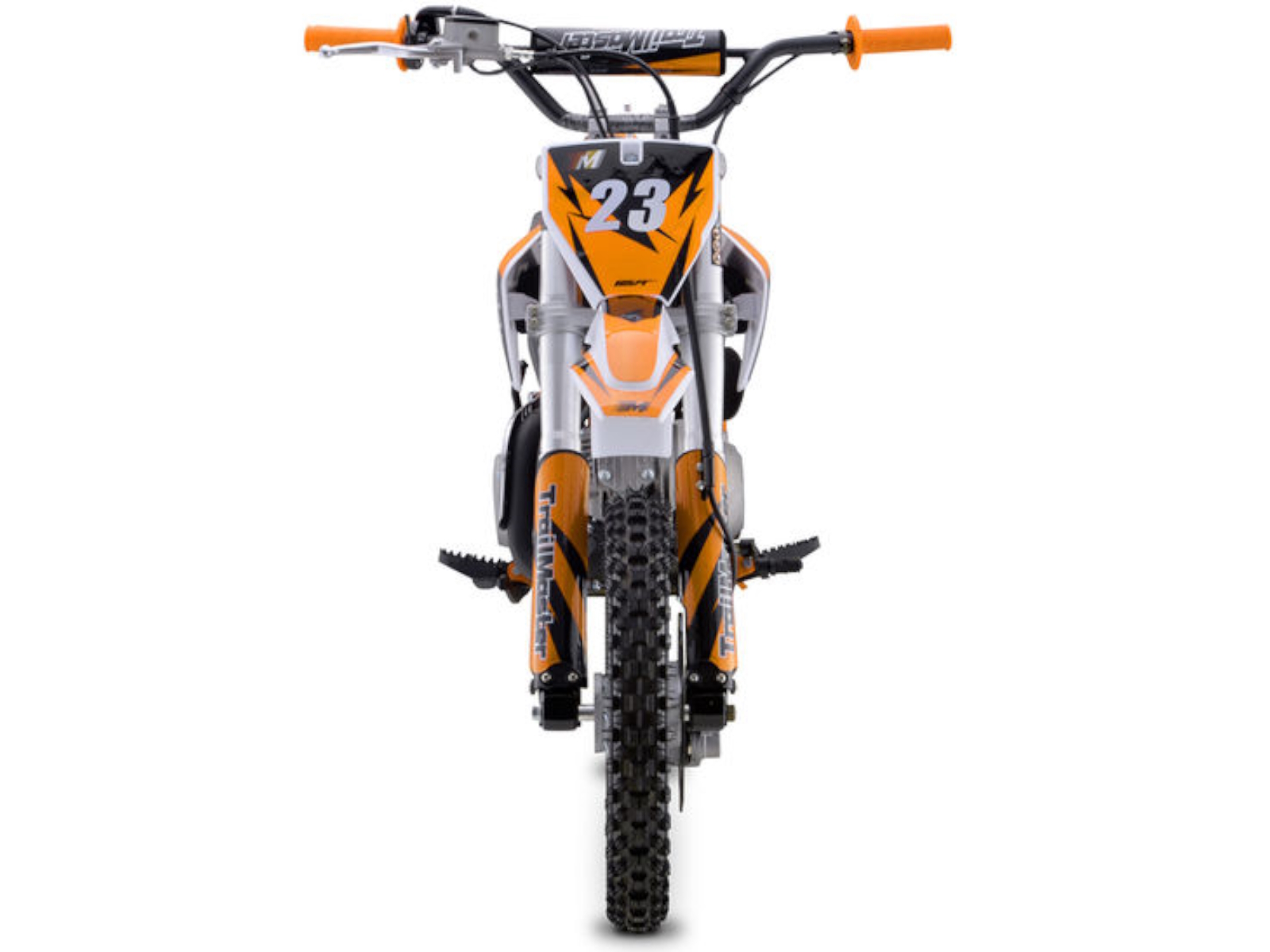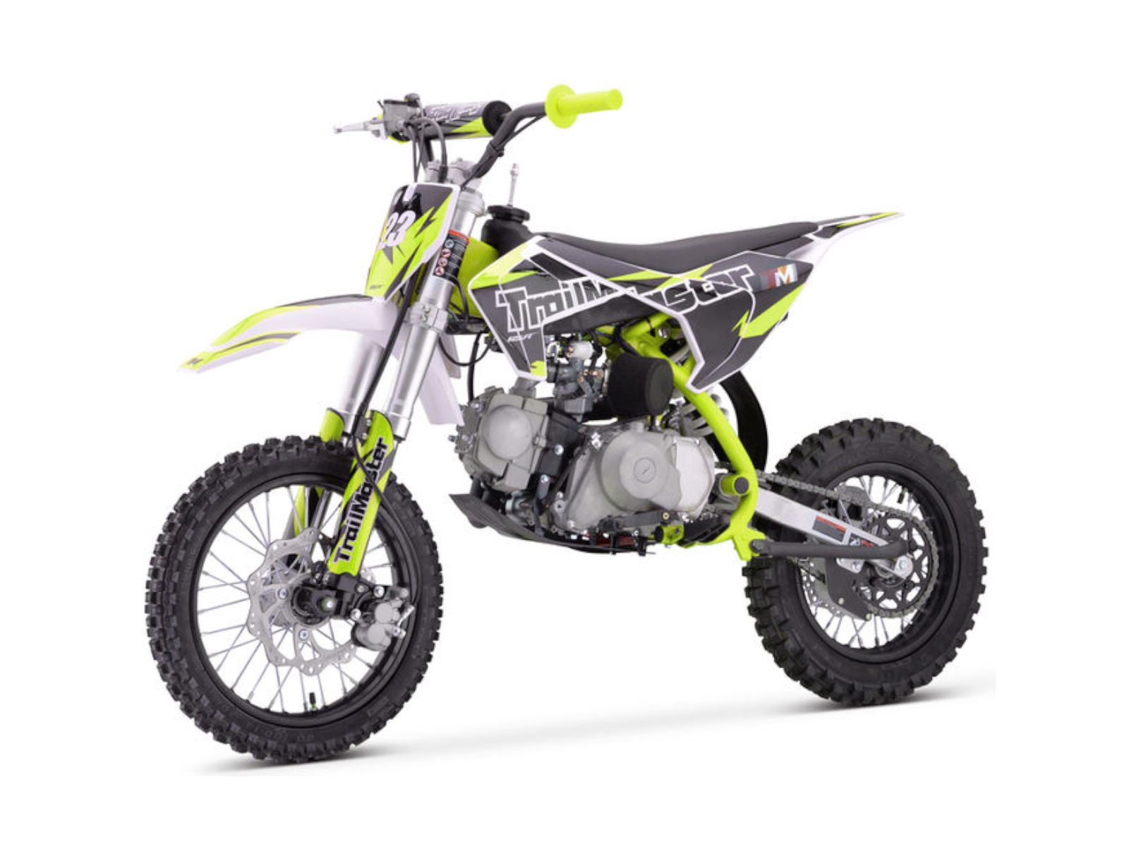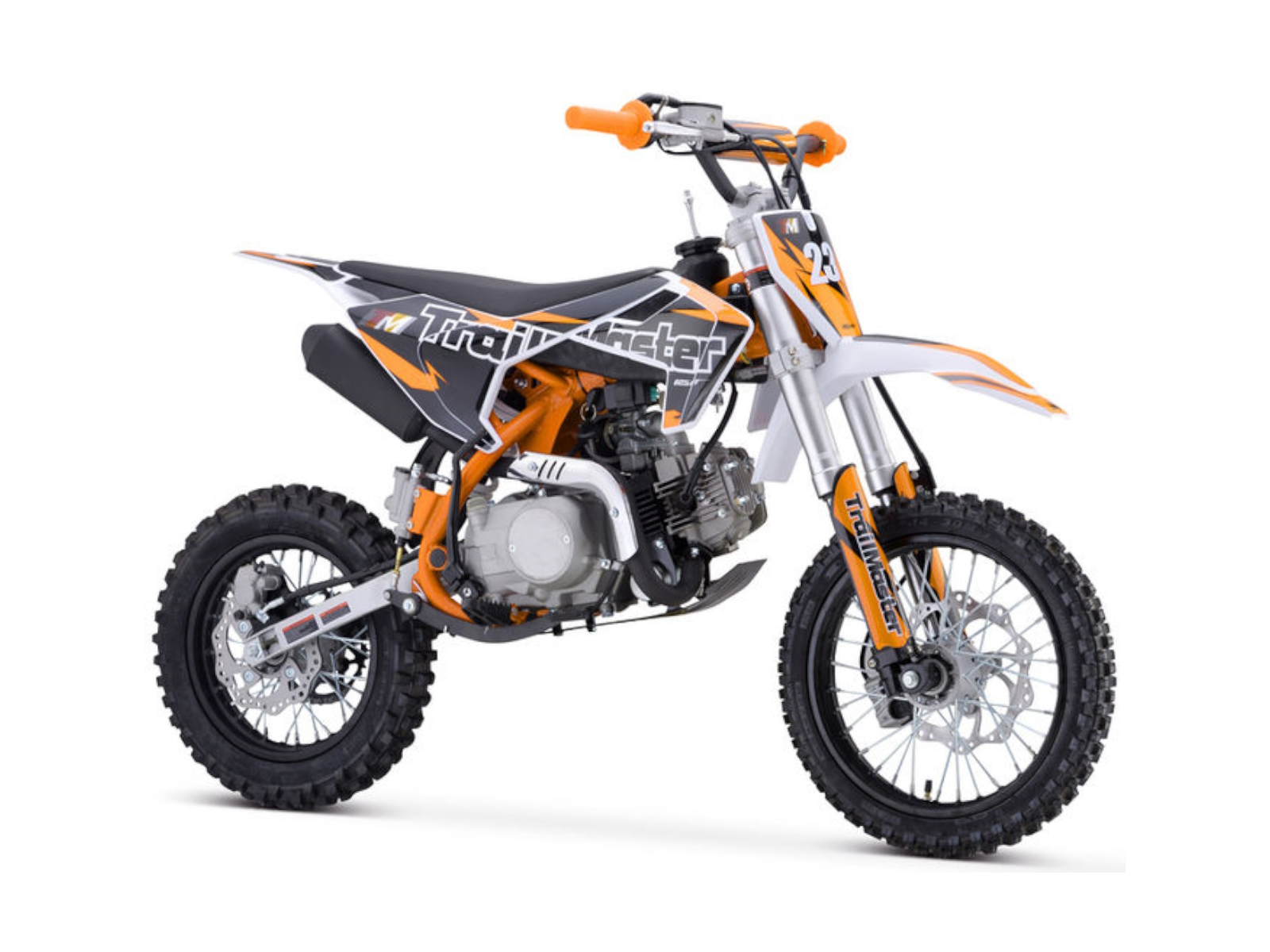 The TM 23‐125 is a great Junior size dirt bike that has both Electric and Kick Start. It has a high performance 125cc 4 stroke 8.3hp engine and a top speed of around 45 MPH and a seat height of 29”. It is available in red, blue, green, and orange colors. The TM23 features a 4 speed Automatic (No Clutch) transmission with front and rear disc brakes, and a heavy duty frame built for durability! This is sure to be a HOT seller! The bikes full on motocross ergonomics and race suspension system make handling feel natural and unforced, and help it navigate over almost any type of terrain. Electronic CDI ignition makes kick starting effortless, keeps the bike running smoothly in all gears and provides a broad, even power band. And at only 161 pounds, the 125cc engine can propel the motorcycle to speeds of 45 miles per hour.